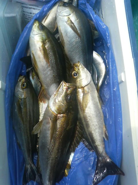 本日三名さんでウマズラ、 イサギ、 アジ、 メジナ、タカベ、 キントキ、 ハタと ぽつりぽつりの 喰いでした! クーラーは にぎやかに なり満足したかな? 明日も イサギ五目で まだ 一人。 水温安定すれば イサギも 喰いたつでしょう あと ビシは サニービシの FLまたは コマセが 調整できるものを 用意して下さい。 あと 日曜日ですが 鯛狙いですので 来てみて下さい。 他船ですが 昨日 大型が あがりましたので! (2008.5.8[Thu])