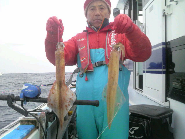 テポドン4点かけ!朝イチ サバ苦戦。 乗りいまいちですが こんなヤリイカいますよ。 詳しくは 後程! 明日も ヤリイカで 空いてます。 遅くなりました。 ヤリイカは 0〜26杯 スルメは 型程度でした。風うねりで バラシ多数。 あと 明日は ヤリイカ半分空きあり〜! 明日は良さそうだけど…? 午後 オニカサゴでてますが 3人さん ボウズなし! 写真は ブログに のせます。 ヤリイカ0は 船酔いの人です。 大型まじりで なんとかなったかな? では 明日逢いましょう! (2010.4.3[Sat])