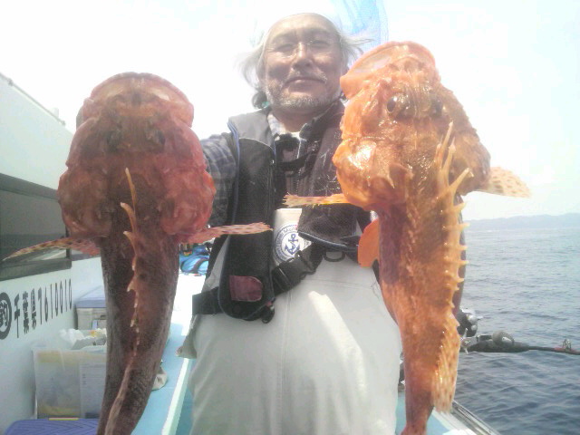 本日要相談の オニカサゴへ!昨日の二枚潮は 治り ちょい潮速かったけど 7時すぎには 3人さん 坊主なし! その後頻繁に 当たりはありましたが 竿頭は 4匹… まぁ 根魚だから このくらいで いいのかな? しかし 今日は 久しぶりに暖かく いいナギでしたよ。 明日は ヤリイカで 空きありますよ! この 高い水温にも 速い潮にも なれて 釣れるかもよ? 今週・中はシケそうだかはよかったら どうぞ。 では また 明日逢いましょう! (2010.4.19[Mon])