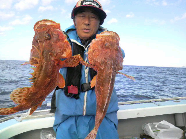 本日イカ〜オニカサゴのご注文!イカは 初心者多くちょこっと乗っただけ〜? 8時半よりオニカサゴイキ船酔いした Yさん除き坊主なしでした。 釣果はやはりリレー釣りはどちらも半端に なるから たいしたことなかったね! オニカサゴ0〜3匹0,7〜1,4キロでした。 あと本日の大型のオニカサゴと ヤリイカの写真は ブログにて! 明日も オニカサゴでますが お客さんちょ〜寂しく空きだらけ。 火曜日祭日は ヤリイカ&スルメで まだ4名ですので ヨロチクビ! では 明日もオニカサゴ釣れますように! 写真のSさん今日は お鍋でオニカサゴ食べてよ。 (2010.11.21[Sun])