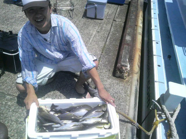 明日は 午前・午後南西強く吹きそうだから 中止になりました!日曜日は風かわし出船出来そうですがまだ半分空きありますよ! 喰わなくても 沖に出れおいらの顔見たいかた いたら予約入れて! 写真は 21日ダイワのテスターの近藤さんの 連れのEちゃん 海悪いからよしたほうが いいよていいましたが 出れるなら出してて言ったからだしました! 9時上がりでしたが クーラー満タンになり 満足して 帰りましたよ。 釣りは遊びで 漁じぁないから 自分が 納得出来そうなら 来てよ。 釣れない時釣れた魚は 嬉しさ人一倍だけどね! なんかブログぽくなってごめんなさいね。 では 気持ちと相談して来て下さいね! さようなら。 (2011.6.24[Fri])