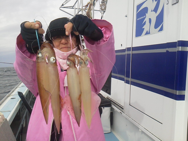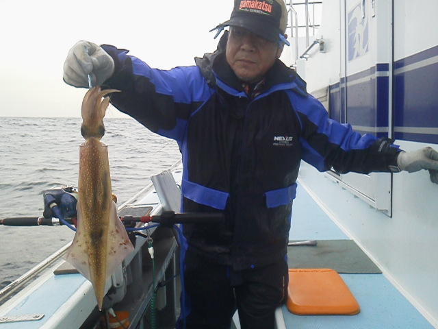 Yさんの奥さんスッキリしましたね!スルメは パパに負けたけど ヤリイカは 勝ちましたね。 本日朝イチ スルメ9点かけなどあり バリバリで ラスト1時間 ヤリイカ狙いポツリとありました。 釣果はヤリイカ混じる程度で 12〜54杯でした! 今週前半は また南西吹きシケそうです。 次回出船は 木曜日ヤリ&スルメからかな? 金曜日も ヤリ&スルメ 土曜日は オニカサゴ 日曜日は ヤリ&スルメ 以上どの日も 空きありますので よろしくね! ではさようなら。 本日竿頭は ブログで 公開します。 あと参考までに 写真の奥さん本日3番手で スルメ24杯ヤリイカ8杯でしたよ! (2012.11.11[Sun])