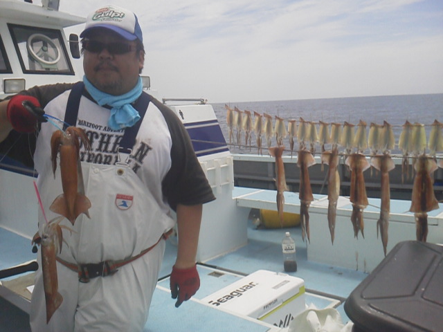 本日もいいお天気でスルメ良く乾きましたよ!明日(1日まだ2名様)からもスルメですが 今週お天気良さそうですががら空きですのでよろぴくね。 釣果は10〜40杯で後半6点かけなどありお土産?になったかな? 写真のYさん二日酔い?竿先折れたロッドで 竿頭でした! お見事ざんした。 ほな さいなら。 (2013.6.30[Sun])