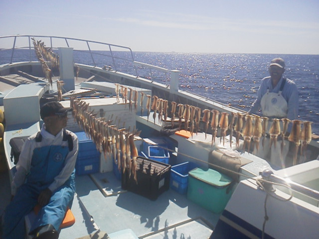 本日も 潮動かず 流し込み出来ずに 苦戦しました!大型台風に備え 午後より 船港奥に非難しますので 台風通過後に 皆さんよろしくお願いいたしますね。 シケ後 ヤリイカ出て来たら楽しみですね! 本日も25センチ前後のヤリイカいくつか混じりましたので 仕掛けは 11センチ〜18センチを フルラインアップで! 釣果は 2〜37杯で 最高7点かけなどもありましたが…? 本日お天気よく スルメ良く乾きました! ほな皆さん次回出船まで さいなら〜。 (2013.10.14[Mon])