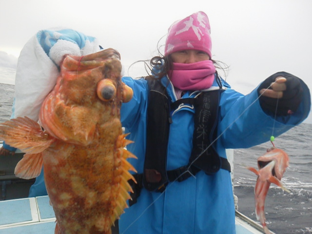 本日雨は午前中もったけど 北風ピューピュー寒かったね!オニカサゴも 後半ダブり2発ありましたが…? 3匹3名様で坊主もでたし放流や 水面バラシも? 喰い込み浅く 皮一枚の喰いだったみたいでした! 19日・20日は 未定でシケみたい! 21日(土)は オニカサゴでまだ2名様!(予報悪く出船中止) 22日(日)は ヤリイカで あと3名様! 23日(月)は オニカサゴで あと2名様! 今年もあとわずかですので 竿納めに よろしくね。 本日デカカンコと ユメカサゴダブりの 写真とりました。 女性の方他に オニカサゴも3匹とり なんとか鍋の具材確保出来ましたね! ほな 次回出船まで さいなら ※ヤリイカ来る人サバ邪魔する時もあるし スルメの仕掛けも ご用意してね! (2013.12.18[Wed])