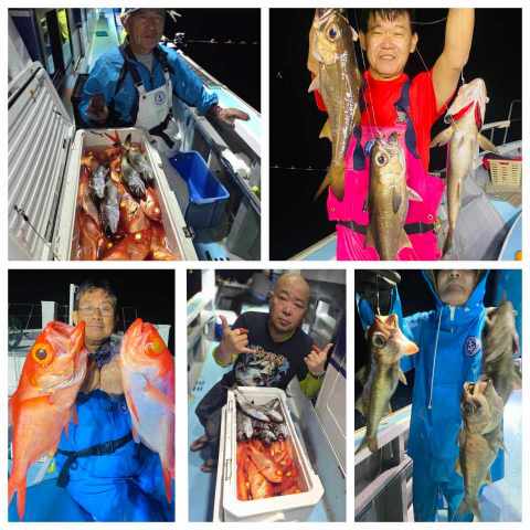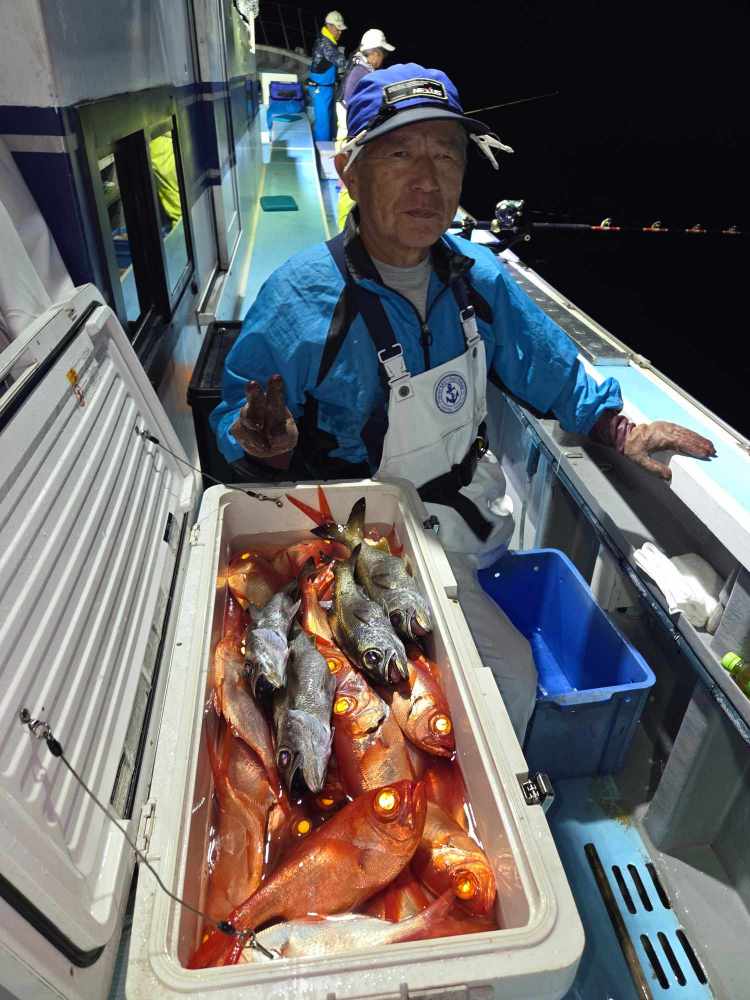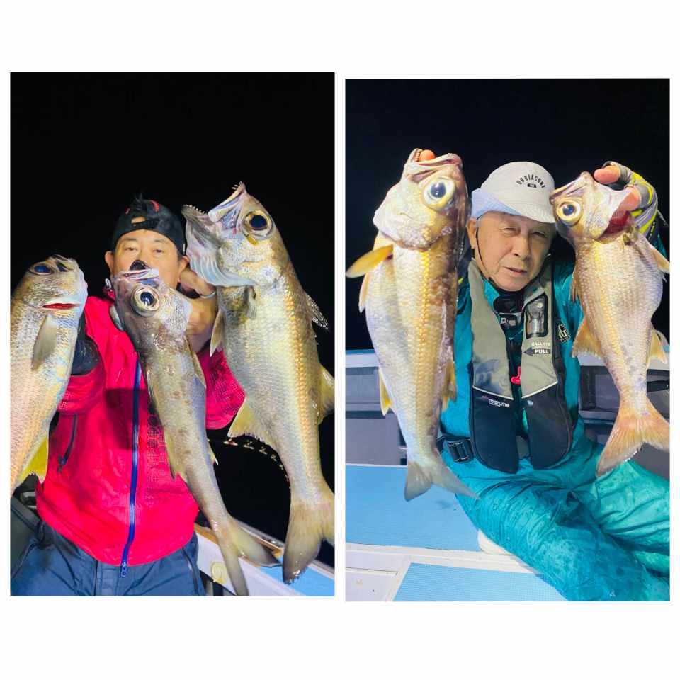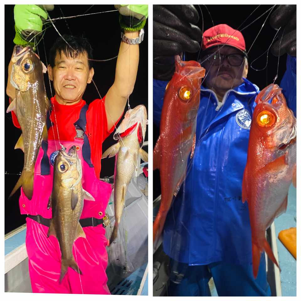 ナイトクラブ二夜目! 本日も満員御礼ありがと!(日曜日まで満員御礼です) 暗くなるまで 少しまごつきましたが 後キンちゃん反応モリモリで 60メートル位の反応も出て来て 仕掛けが途中止まって下まで降りない時も! そんな訳で今夜もムツが喰う前にキンちゃんが! たまに上がるムツは良型でしたが 今夜もキンちゃん祭りに! それでもお客さんバリバリ釣れたのでにっこりちょいと早上がりでした! このキンちゃん祭りいつまで続くやら! お祭り終われば デカムツの潮になると思いますのでよろしくお願いいたします 当船限定8名様ですので わりと早めに予約しないと満タンになるので 土日予約の方はお早めに 今夜の釣果は見てのとおりで皆さんクーラーホクホクでした! ほなさいなら〜 (2025.10.2[Thu])