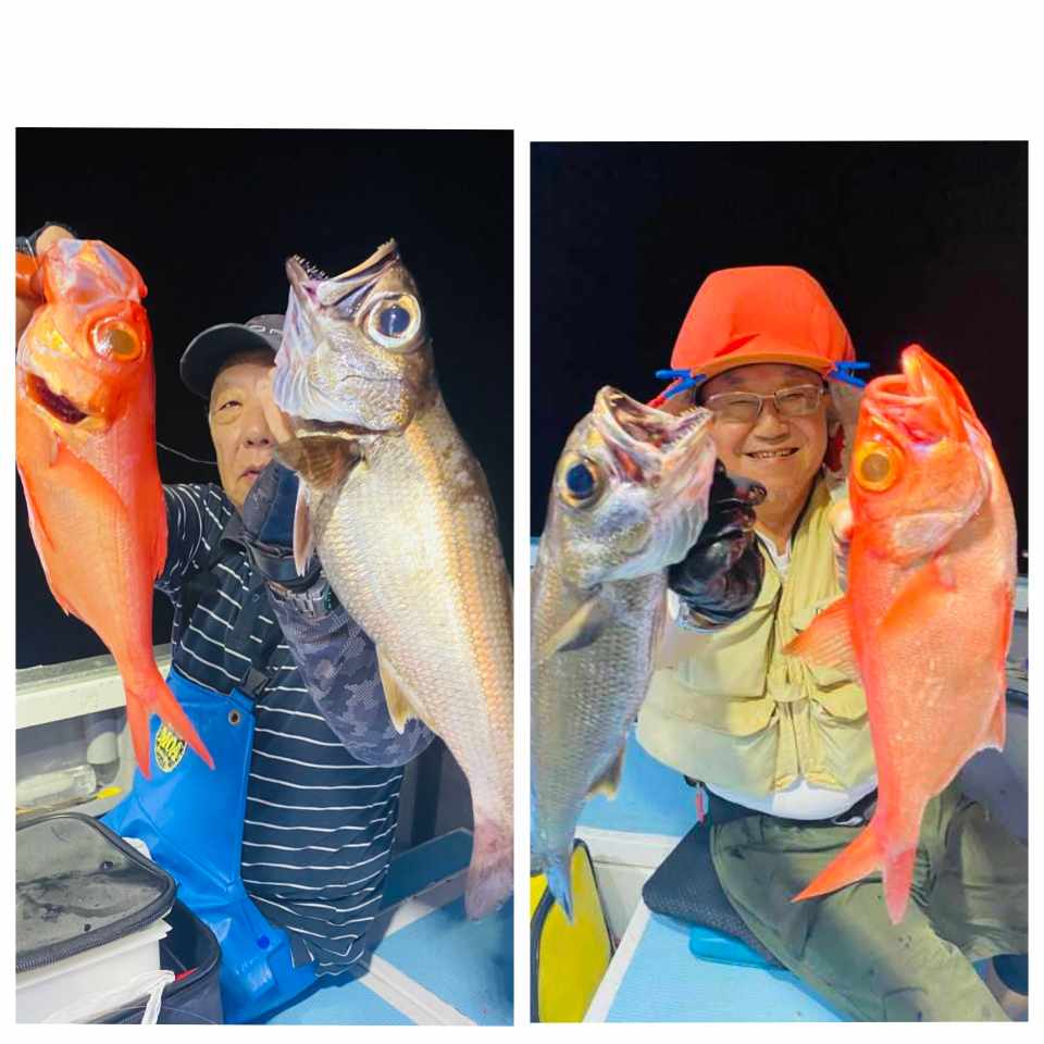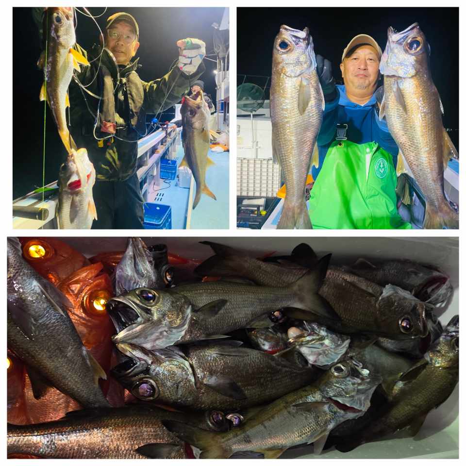 本日もオニカサゴに出船! 小雨降り少し涼しくなりました オニは坊主なしの頭で四匹が2名様でしたが 本日もカンコと夢カサゴが大漁でした! 今夜からナイトクラブ信栄開店ですのでまた後で! こんばんみ〜ナイトクラブ信栄初日は マズメからムツダブリなとあり 潮よく大きく流せましたよ!! 暗くなってからは キンちゃんが元気に顔出してきてムツが喰う前に8989と! キンちゃんも30センチオーバーが 多数混ざったので良しとしましょう! 毎年早いこの時期はキンちゃんが喰ってきますので ムツ1本と言う訳にはいきませんが 赤黒と1089したので!! 詳しくは皆さんには聞いていませんが 参考までには貸し竿夜遊び初挑戦の方でも キンちゃんムツで40匹オーバーとれムツ三割キンちゃん七割って感じです! 今週日曜日まで凪良さそうで若干空きあるので 早い者勝ちかもね ほなさいなら〜 (2025.10.1[Wed])