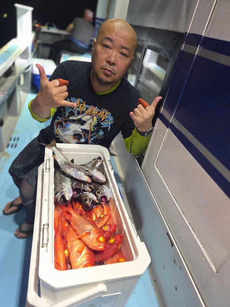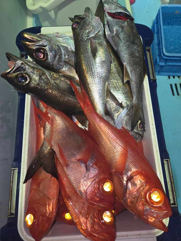 今夜も満タン御礼ありがと! マズメはいまいちでしたが 暗くなるにつれまたまたキンちゃん反応がバリバリと!! そんな訳で ムツが喰う前にキンちゃんが! でも良型混じりで8989しますのであとは手返し次第でクーラーがどんどん赤く埋まりましたね! 今期はまじで潮が緩くて釣りやすくいい感じの潮ですよ 毎年早いこの時期キンちゃん祭りでこの祭りが終わるとムツ祭りになると思いますが… 釣果はクーラー満タンの方多くお土産バッチリでしたよ さて明日ですが なんか雨模様で 中止かも? ※予約の時に必ず当日家出るまえに出船の確認をと! 雨=低気圧通過するので 海悪くなるので 安全第一ですのであしからず ほなさいなら〜 (2025.10.3[Fri])