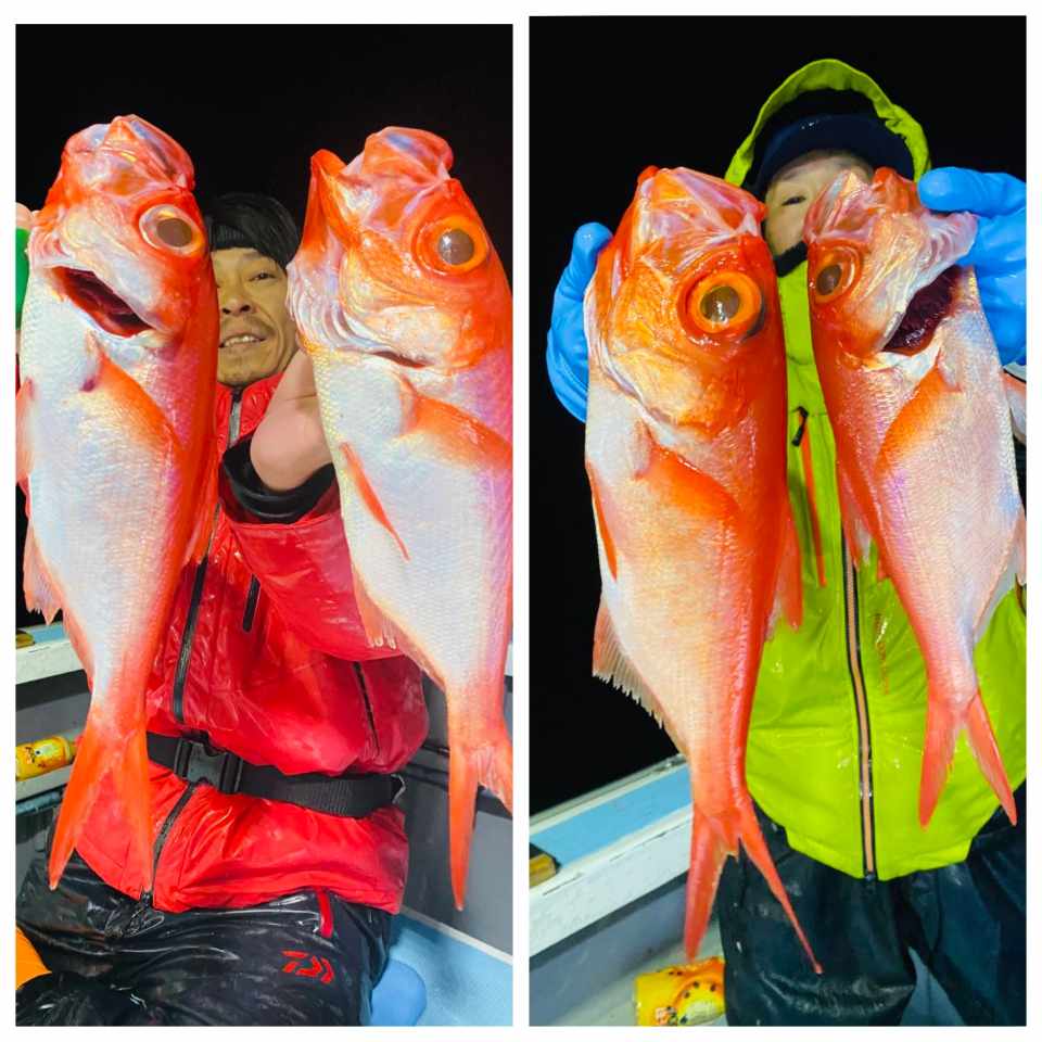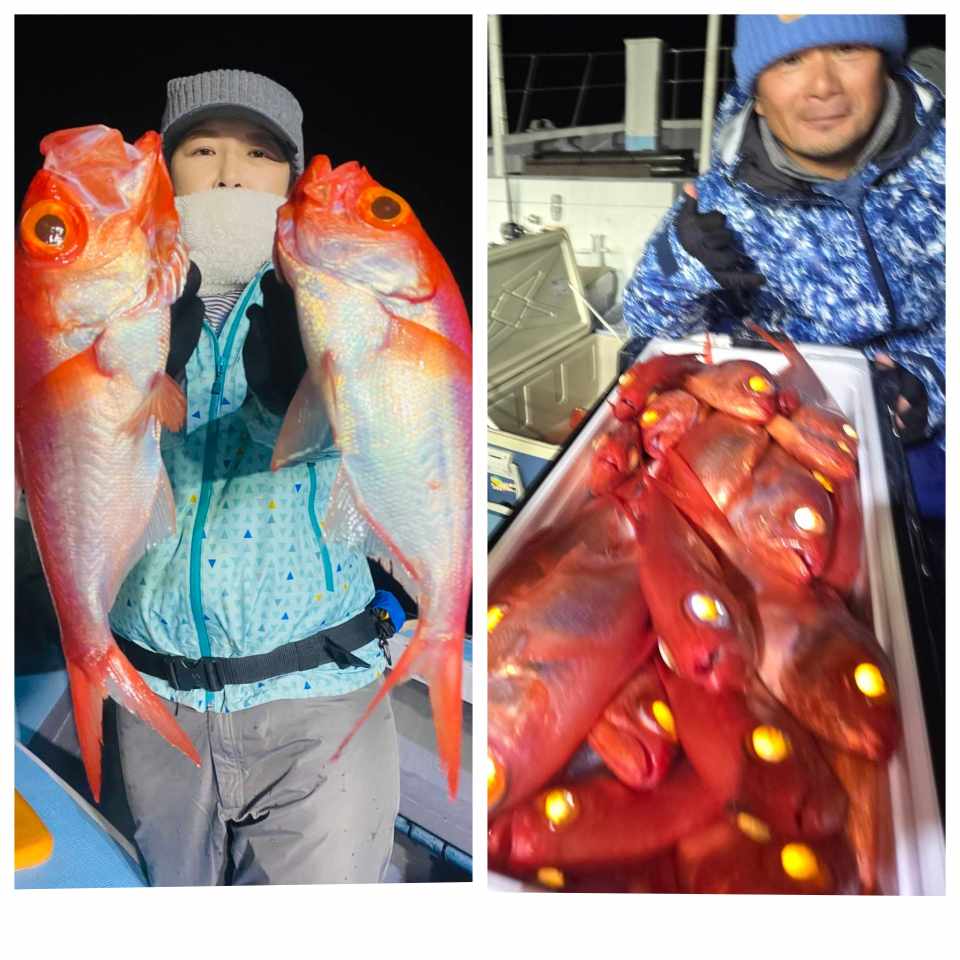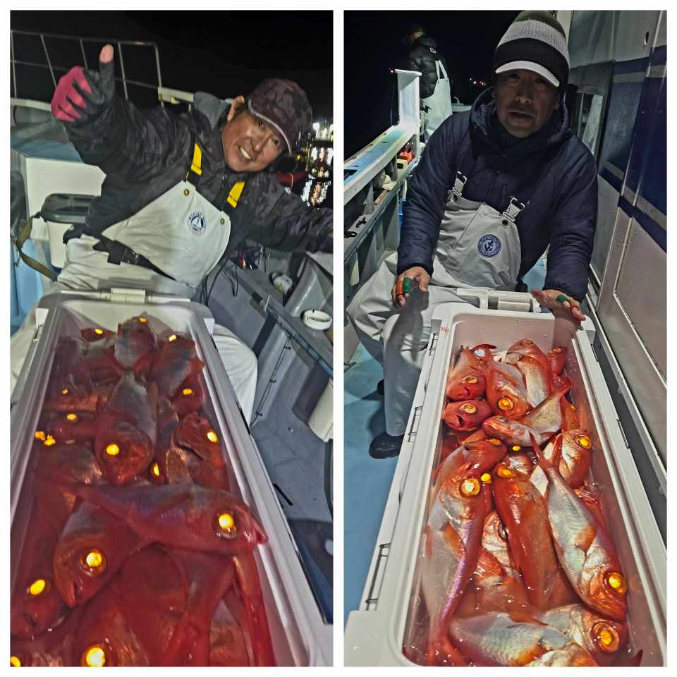 本日はベタ凪の予報で出船しました! 最初は風弱かったけど 後少し吹いて来ましたね! でも今夜も キンちゃん元気でしたよ! 時々ぞろぞろとありました! 年明け良型多く毎夜お土産バッチリになっていますよ 後半空から雪が 降って来て海も悪くなって来てちょっと早めに上がらせてもらいました! 明日この調子で行きたいけど 南西風が夜強くなる予報だし明後日土曜日はさらに強まるみたいだし!! 今月ありがたいことに 夜キンメは満員御礼ですが 2月は平日 日曜日は空きいっぱいありますので 予報たにらめっこしてご予約お待ちしています 釣果はクーラー満タンの方も! ほなお休み〜 (2026.1.22[Thu])