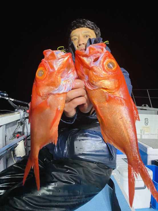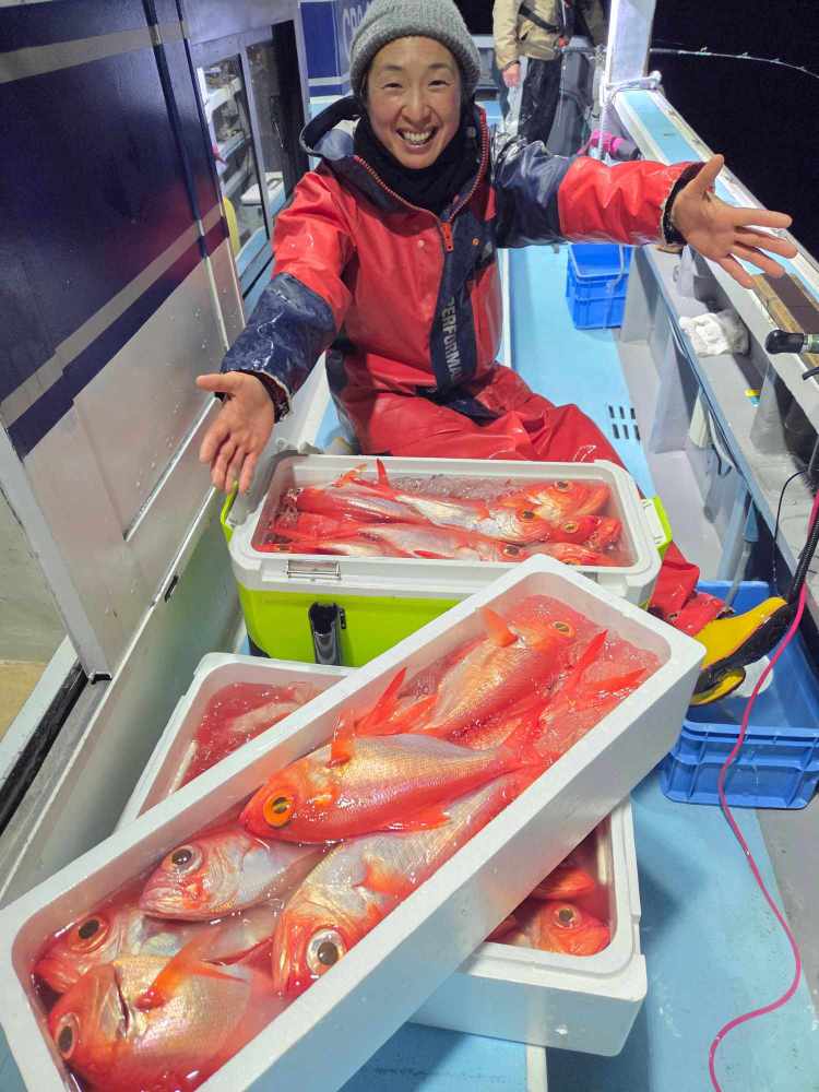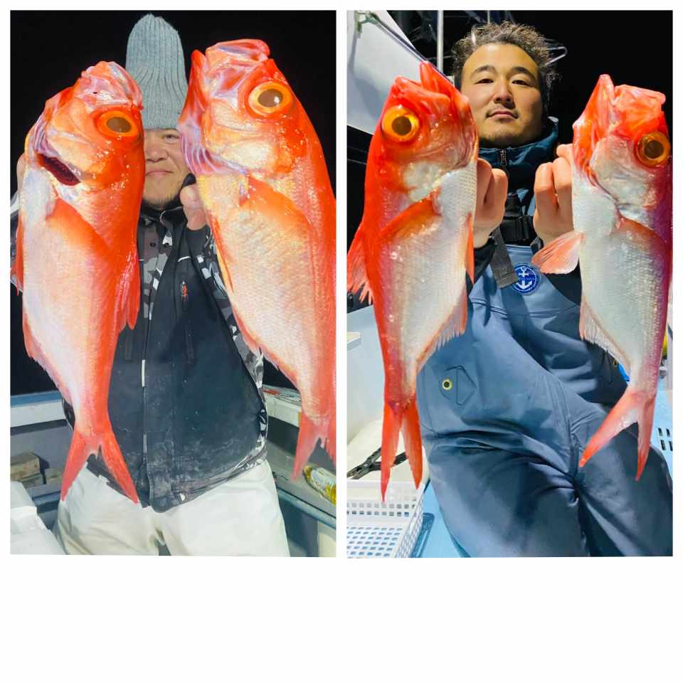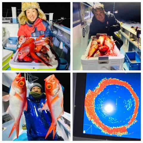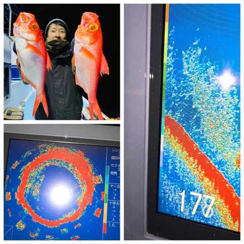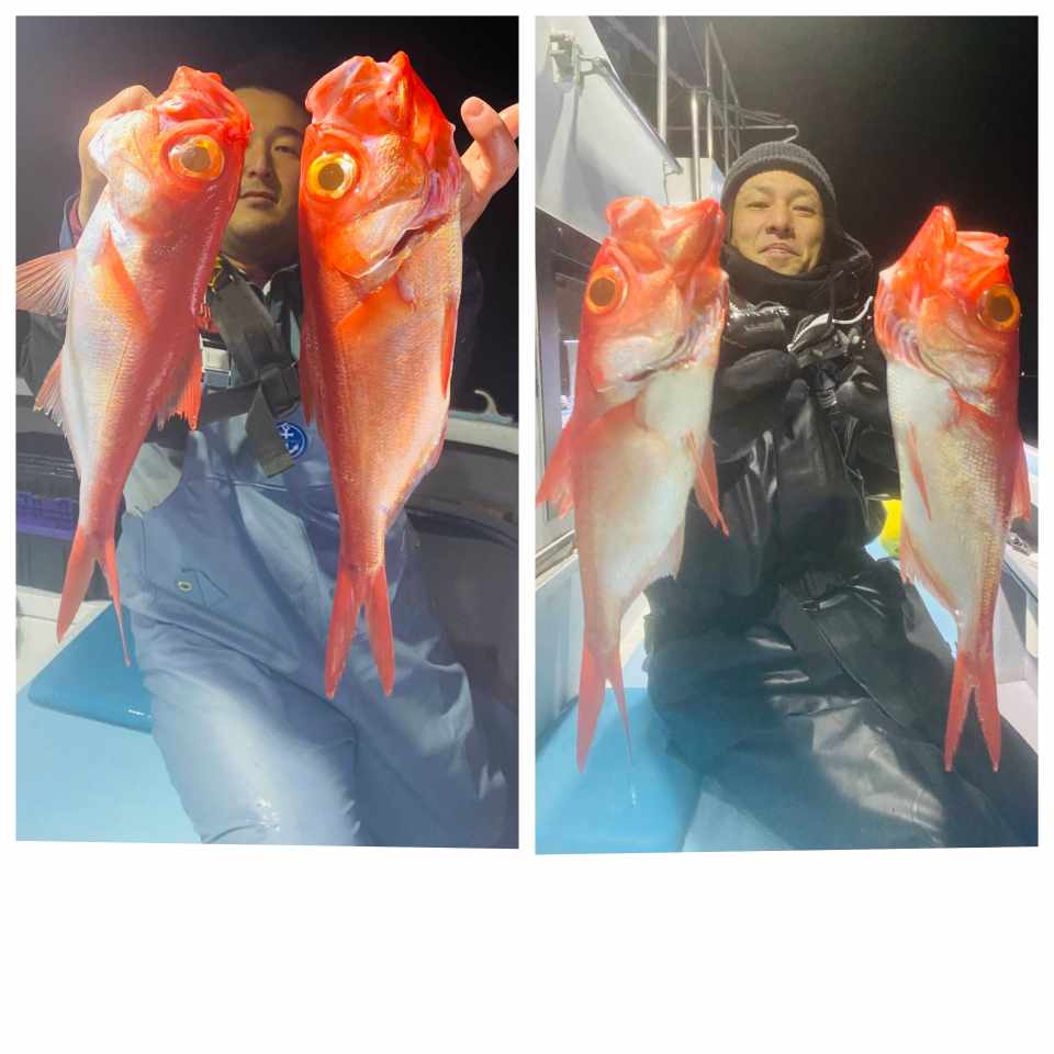 本日はベタ凪の予報で出船しました! 最初は風弱かったけど 後少し吹いて来ましたね! でも今夜も キンちゃん元気でしたよ! 時々ぞろぞろとありました! 年明け良型多く毎夜お土産バッチリになっていますよ 後半空から雪が 降って来て海も悪くなって来てちょっと早めに上がらせてもらいました! 明日この調子で行きたいけど 南西風が夜強くなる予報だし明後日土曜日はさらに強まるみたいだし!! 今月ありがたいことに 夜キンメは満員御礼ですが 2月は平日 日曜日は空きいっぱいありますので 予報たにらめっこしてご予約お待ちしています 釣果はクーラー満タンの方も! ほなお休み〜 (2026.1.22[Thu])