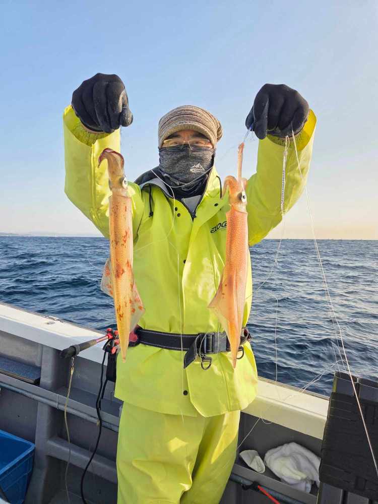 | 本日2名様ヤリイカに! 朝一はさほど吹いていませんでしたが 後北風ビュービューで海は悪いし乗らないし!! バーサーもゴイスーだしいいとこなしで三点ありましたが ツ抜けしません で海悪く少し早めの上がりにならごめんなさいでした! イカ来る方は14センチ直結も持参してね 簡単ですが このへんで さいなら〜 (2026.3.10[Tue])