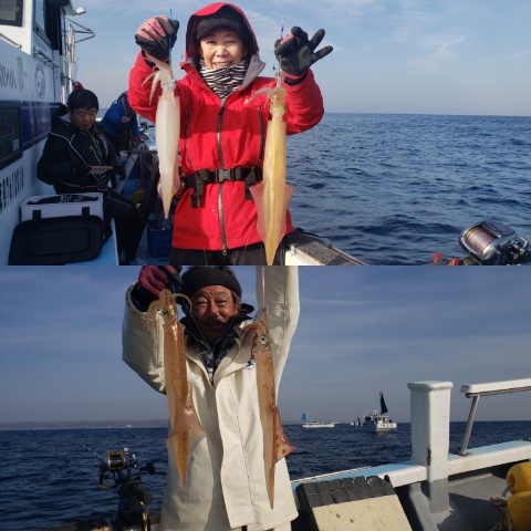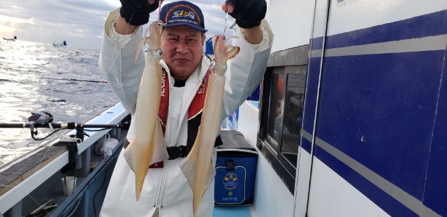 本日二組のグループでの出船! 朝イチから多点かけありムムム〜! 凪たらすぐにまだヤリイカ来てない方まだ釣り足りない方初心者の方も急げ〜! 広範囲にヤリイカいるから今期ヤリイカ心配ないかもね! 本日釣果は10〜32杯でほとんどの方は20杯以上釣れてお土産なはなりました! 今日はグループの方でマイペースで和気あいあいと凪で温かくいい釣りになったみたいで良かったです 同ポイントバリバリの船もあったようですよ ほなさいなら〜 (2020.2.15[Sat])