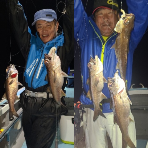 本日もムツマズメに8989して四点かけも!今夜はなんだか行けそう〜な?? ですが昨夜と同じで徐々に喰い悪くなり最後までパッとしませんでしたね?? 釣果は若干ツ抜けした方がいましたが おかずだけの方も! まぁシケ後期待って言うことに! 今夜のお客さんごめんなさい ほなさようなら〜 ※シケ続きそうなんで ご予約の方は現地確認を (2024.11.1[Fri])